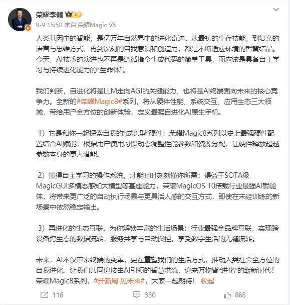 早在9月9日,荣耀CEO李健微博预热 Magic 8 系列时就表示,全新的荣耀 Magic8 系列,将从硬件性能、系统交互、应用生态三大领域,带给用户全方位的创新体验,定义最强自进化 AI 原生手机。
