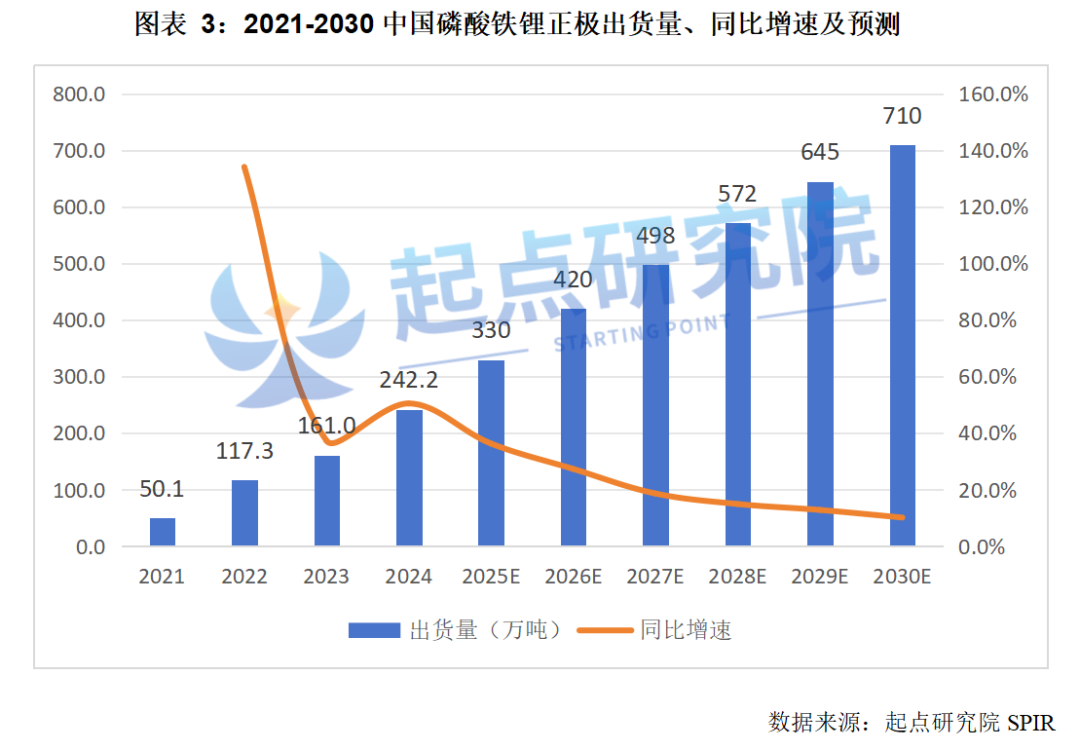起点研究院SPIR预计2025年中国磷酸铁锂正极出货量将达330万吨,同比增长36.3%;预计到2030年中国磷酸铁锂正极出货量有望达710万吨,未来6年年均复合增速达19.6%。